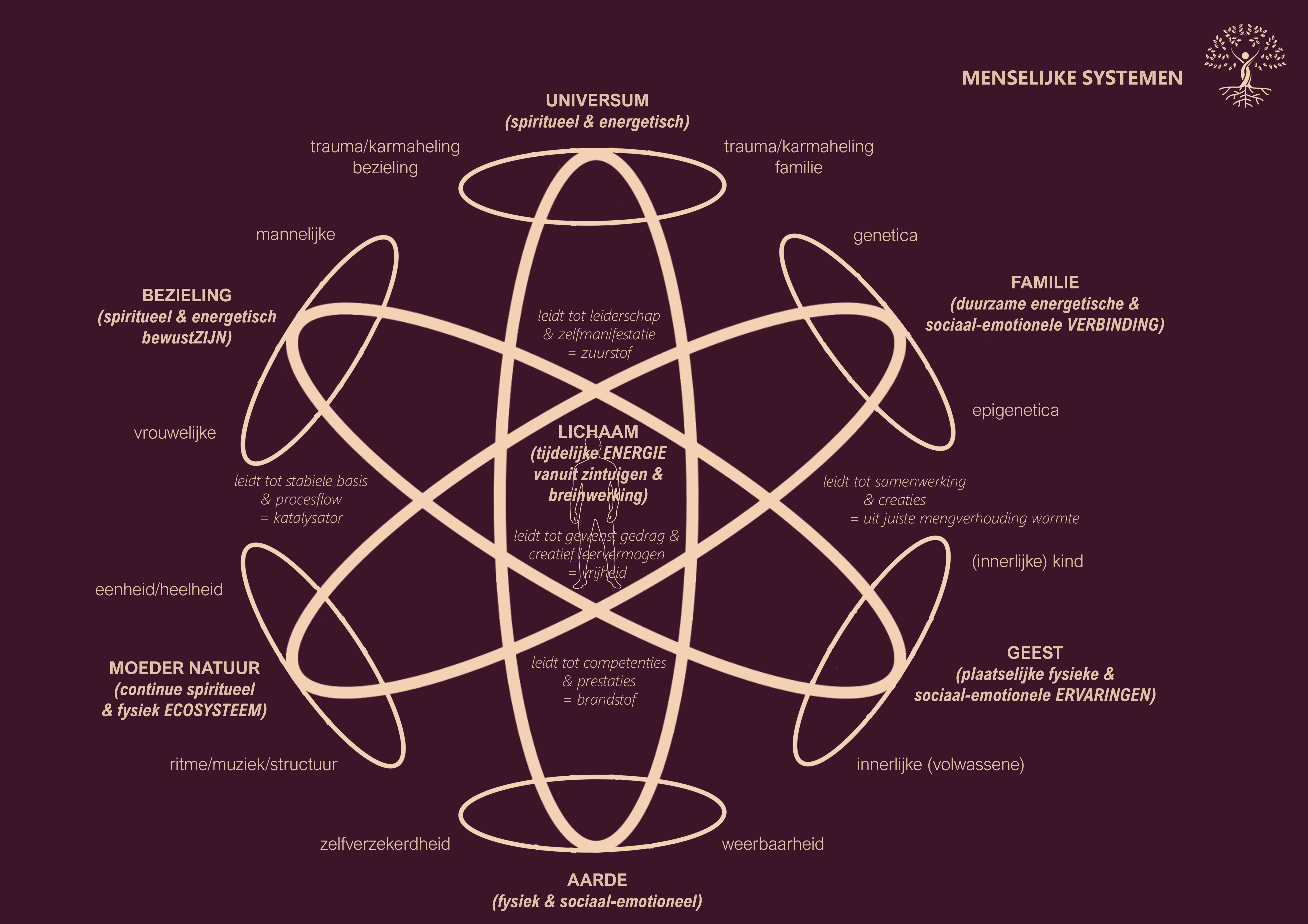 Alle invloeden binnen dit menselijke systeem komen tot uiting in het mentale welzijn en de fysieke gezondheid van de mens. Hier komen denk-, voel- en leefpatronen uit voort oftewel het gedrag en het leervermogen.